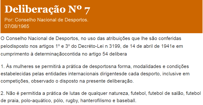 Ao longo do século XX, as mulheres começaram a reivindicar mais espaço no esporte. Há registros de partidas de futebol e provas de remo disputadas por mulheres logo nas primeiras décadas do século. Mas a luta por reconhecimento no meio esportivo estava apenas começando. Em 1941, o Decreto-Lei nº 3.199 proibiu que as mulheres praticassem esportes que fossem “incompatíveis com as condições de sua natureza”, cabendo ao Conselho Nacional de Desportos (CND) regular essa prática. Em 1965, o CND publicou a Deliberação nº 7, que especificava quais eram esses esportes: lutas de qualquer natureza, futebol, futebol de salão, futebol de praia, pólo aquático, pólo, rugby, halterofilismo e baseball. A prática esportiva, associada à competitividade e à agressividade, era vista como uma espécie de ameaça à feminilidade, à delicadeza, à beleza e à sensualidade da mulher. Somente em 1979 essa deliberação foi revogada.