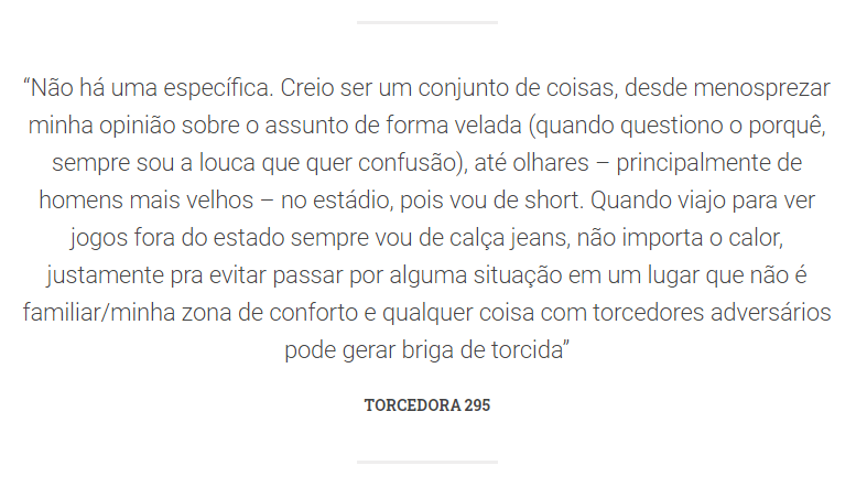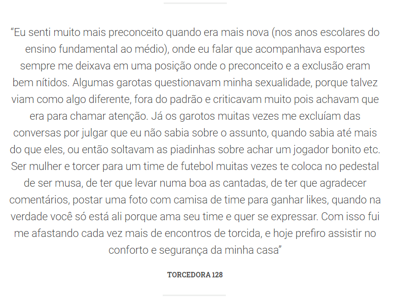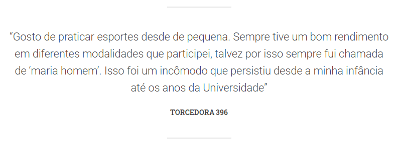 “No que diz respeito à discriminação de gênero, duvido muito encontrarmos uma mulher que não a tenha sofrido no âmbito esportivo. Qualquer mulher que, minimamente, ousa expressar sua opinião, mesmo que virtualmente, tem sua voz silenciada ou diminuída”.