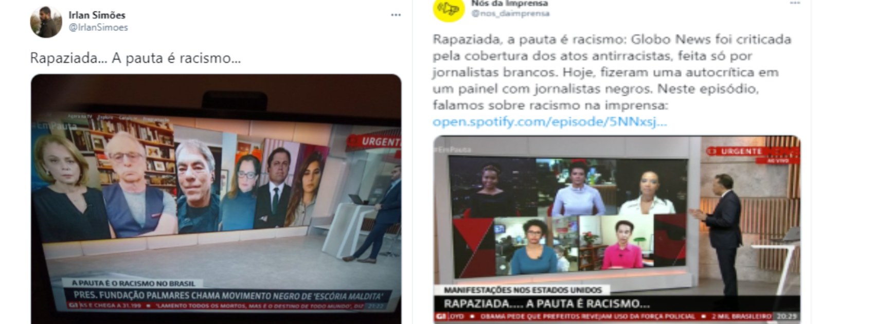 A professora Karla destaca o episódio envolvendo a Globo News, em 02 junho de 2020, quando, no programa “Em Pauta”, o assunto discutido era o racismo nos EUA. O que chamou a atenção dos espectadores, contudo, foi que no painel só havia comentaristas brancos para discutir a pauta em questão. O caso teve enorme repercussão nas redes sociais e o canal de notícias a cabo foi muito criticado.