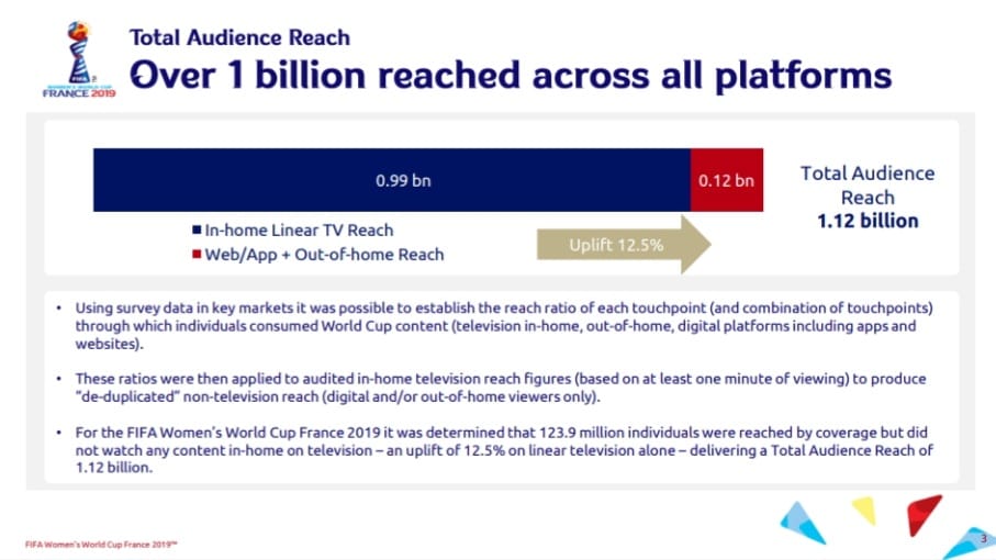 A Copa do Mundo na França foi a competição feminina da FIFA mais assistida de todos os tempos e representou um significativo aumento de audiência para o futebol feminino. Consequentemente, foi essencial para que a modalidade conquistasse mais espaço na televisão. No mundo todo, seja por streaming ou pela televisão, o torneio feminino conquistou a audiência de mais de 1 bilhão de pessoas. A grande final entre EUA e Holanda foi acompanhada por cerca de 82.2 milhões de pessoas, quase 60% a mais que a edição de 2015. Tayna, que também trabalha com cobertura do futebol feminino como comentarista do Campeonato Paulista Feminino pelo TNT Sports, conta que é muito representativa a mudança de chave que aconteceu ao futebol feminino nos últimos anos.