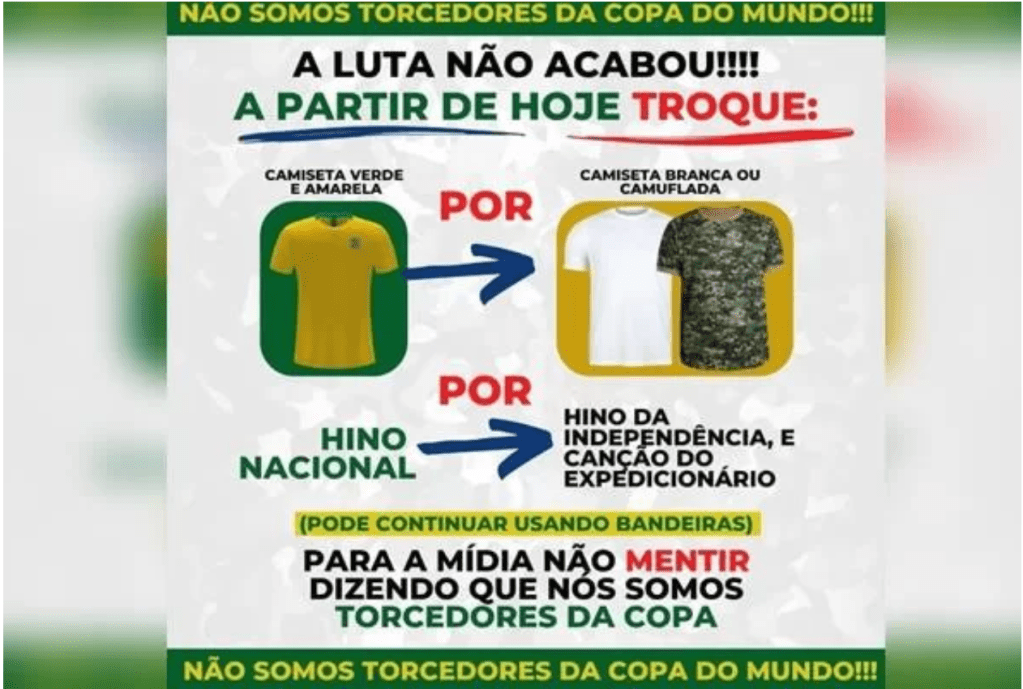Assim como torcedoras e torcedores estavam receosos com o verde e amarelo, apoiadores do candidato derrotado também demonstraram preocupação com o uso da camisa canarinho e adoção de outros símbolos nacionais. Circulou pelas redes durante o mundial recomendações para que bolsonaristas evitassem o verde e amarelo para que não fossem confundidos com torcedores.