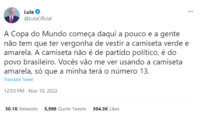 “Usar a camisa do Brasil hoje faz as pessoas que são Bolsonaro nos abordar e temos que ficar ouvindo absurdos. Eles perderam a noção e se apoderam da bandeira e camisa como se fossem deles, e após tudo que fazem, quando vemos alguém com elas, já esperamos o pior… Infelizmente!”