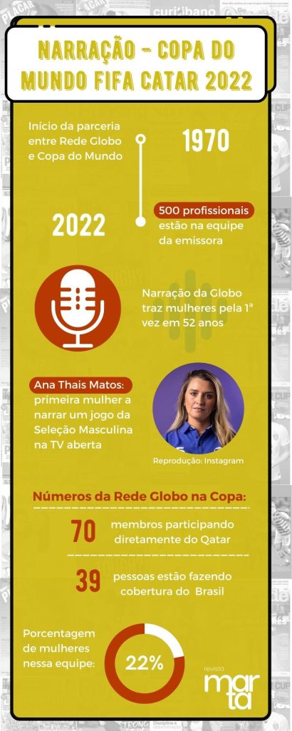Hoje uma das referências dos comentários esportivos brasileiros, Ana Thaís Matos também é muito engajada na pauta feminista. Antes mesmo de ascender nacionalmente na Globo, ela já cobrava uma maior inclusão feminina nas redações e estúdios jornalísticos, defendendo que as mulheres deveriam passar a ocupar um lugar de também expressar sua opinião no esporte, não apenas oferecendo entretenimento aos homens, como aconteceu predominantemente por muitos anos. A liberdade das mulheres no Catar, evidentemente, foi tema de suas falas recentes. Em entrevista ao G1 às vésperas do evento, Ana concordou que a Copa seria masculina, mas deixaria um legado feminino ao país-sede após o evento.