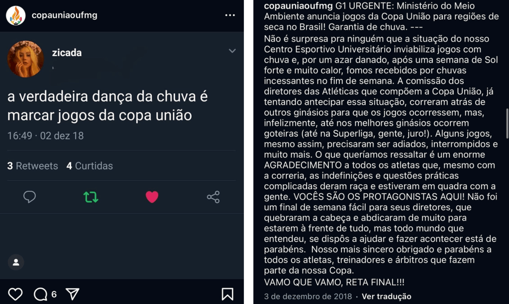 #paratodosverem: A imagem apresenta duas postagens sobre a Copa União UFMG no Instagram. À esquerda, há um tweet de uma usuária chamada “zicada”, dizendo: “a verdadeira dança da chuva é marcar jogos da Copa União”.