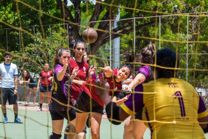 #paratodosverem: A imagem mostra uma partida de handebol feminino em uma quadra ao ar livre, cercada por árvores e vegetação ao fundo. No centro da cena, vemos uma jogadora de uniforme vermelho realizando um arremesso em direção ao gol. À sua volta, outras jogadoras de uniforme roxo tentam bloqueá-la, enquanto uma jogadora de uniforme amarelo com o número “1” nas costas está posicionada como goleira, pronta para defender o lance.