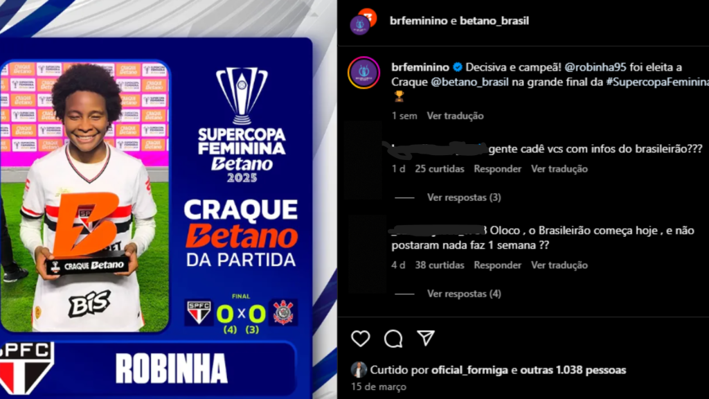 O Brasileirão Feminino teve início no último fim de semana (22 e 23 de março), mas o perfil oficial do campeonato no Instagram não é atualizado desde o dia 15 de março, quando ocorreu a final da Supercopa Feminina, em que o São Paulo foi campeão diante do Corinthians.