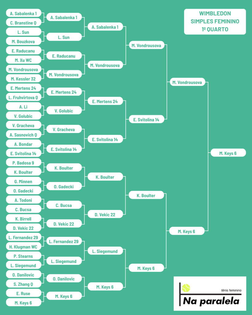 Estou apostando também que Bia Haddad avança até às quartas, quando penso será difícil bater Diana Shnaider. A russa, que também é canhota como Bia, tem um estilo versátil que funciona bem na grama. Em Berlim, ela conseguiu arrancar um set de Vondrousová. Shnaider fez também final de duplas em Queens onde jogou ao lado de Anna Danilina e acabou derrotada para Asia Muhammad e Demi Schuurs.
