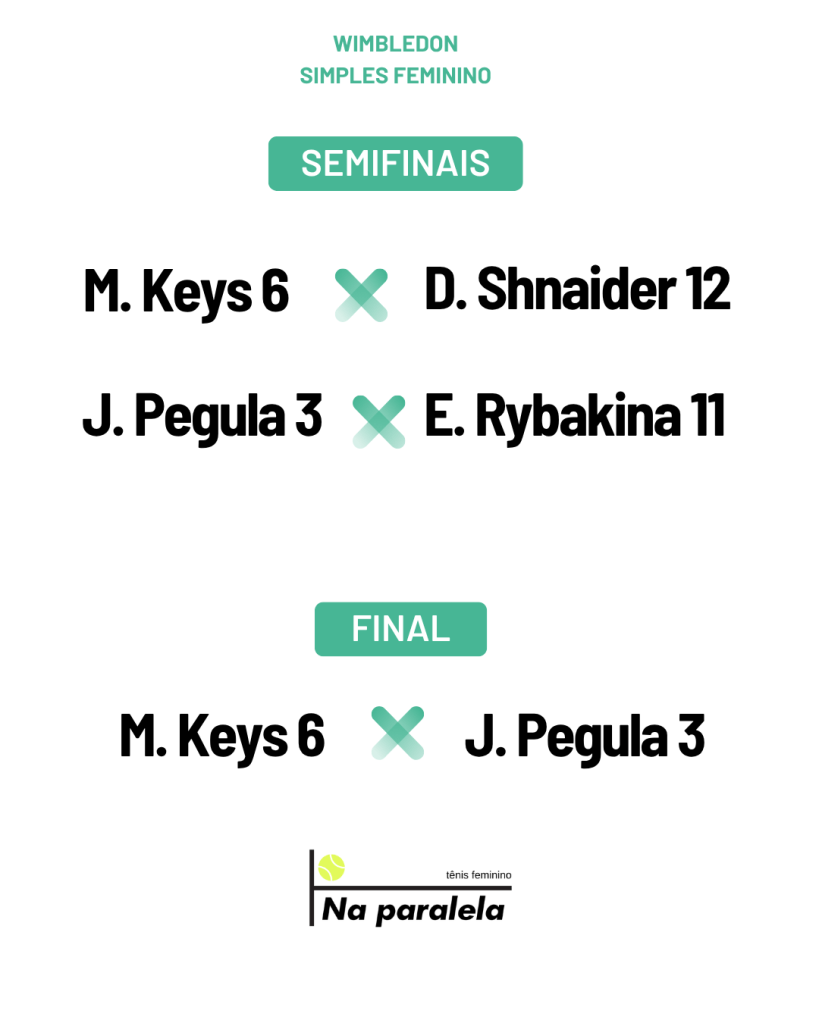 No simples, aposto que o terceiro grand slam do ano será mais uma vez faturado por uma estadunidense. Minha aposta é em Jessica Pegula que segue muito consistente e vem de título em Bad Homburg na última semana. Pegula terá desafios pelo caminho, começando pela segunda rodada em que ela pode enfrentar a campeã de Queens Tatjana Maria e seu jogo pouco usual (baseado nos slices), mas muito eficiente na grama.