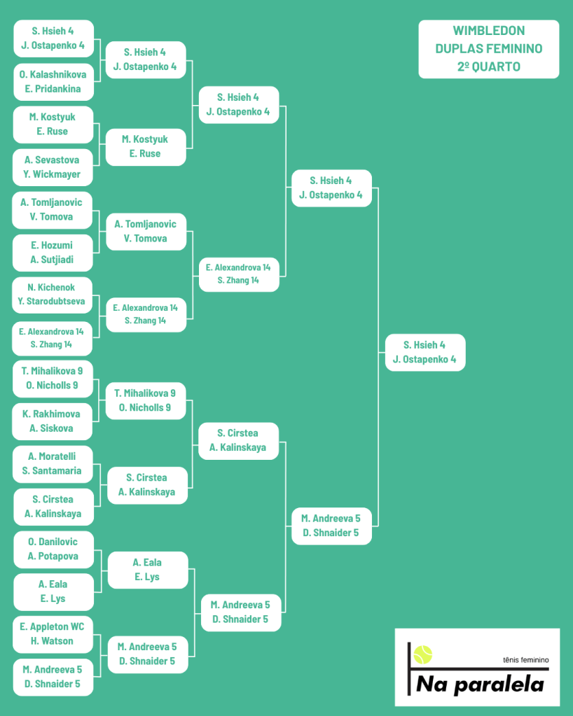 Nas duplas, estou apostando numa final “antecipada” nas semis entre Taylor Townsend/Kateřina Siniaková e Hsieh Su-wei/Jelena Ostapenko. Jogo difícil de prever o resultado, mas estou apostando em Hsieh e Ostapenko porque Hsieh é tetracampeã de Wimbledon e sabe os caminhos na grama de Londres.