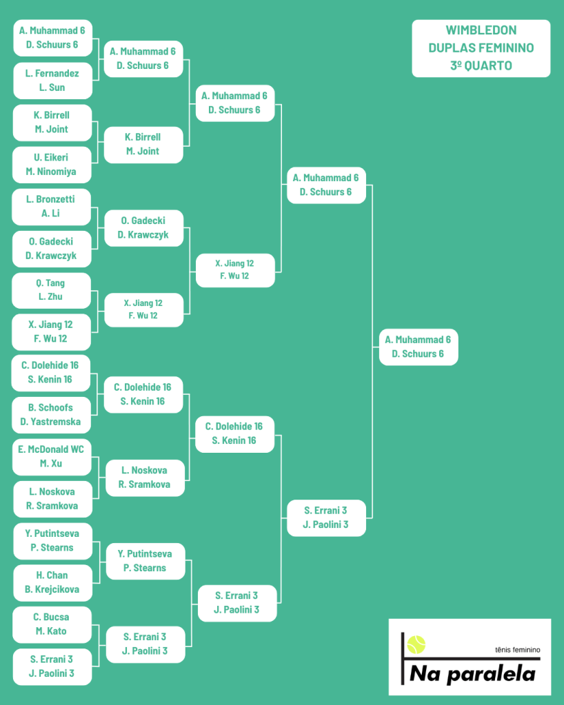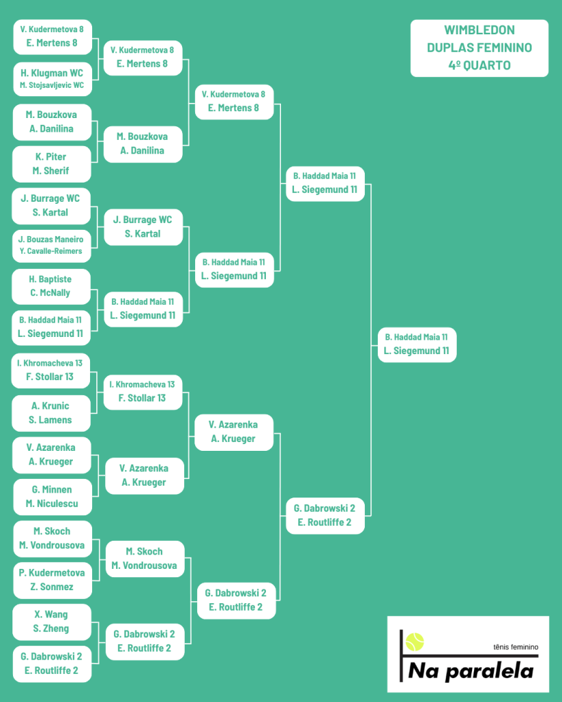 Sobre as brasileiras, Bia e Luisa chegam com boas perspectivas. Bia ganhou Nottingham nas duplas e Luisa fez semis em Bad Homburg. Minha aposta é que Luisa e Timea, sua parceira, façam quartas e Bia e Laura façam semis. Acho Bia/Laura uma ótima formação na grama. Bia tem potência e um golpe de fundo de quadra que é muito eficiente na grama. Laura tem mão na rede, um bom slice e experiência para complicar as adversárias com golpes pouco usuais, baixando a bola ou colocando uma boa dose de side spin.