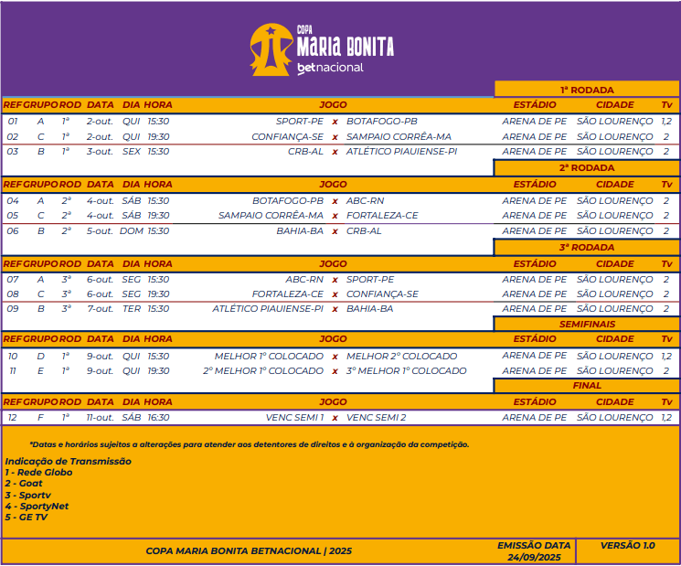 Todos os jogos serão transmitidos pelo canal “GOAT” no Youtube, e também contam com exibições na Globo Nordeste, Sportv e Globoplay. A final ocorrerá no dia 11 de outubro, sendo disputada pelos clubes vencedores das semifinais.