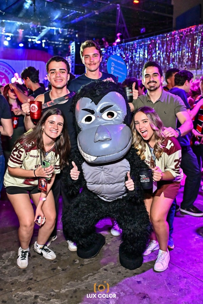 “Todas as nossas festas são baseadas justamente no macaco. Temos o ‘Planeta dos Macacos’, que é a nossa recepção dos calouros, e a ‘Welcome to the Jungle’, a calourada oficial”, explica Maria Clara.